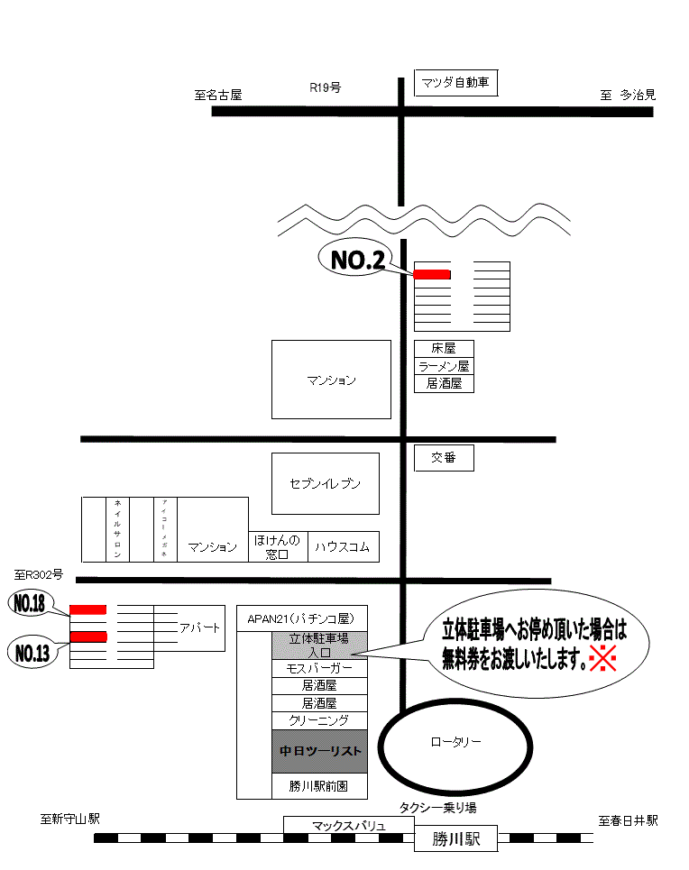 | JR勝川駅北口 徒歩30秒 マックスバリュー勝川店の目の前です。 お車でご来店の折は当社専用P又は松新駐車場をご利用ください。 |