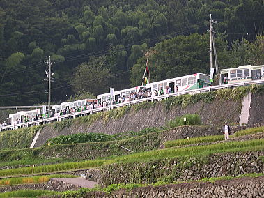 バスでサミット参加者が棚田を見学に次ぎから次ぎへと訪れる