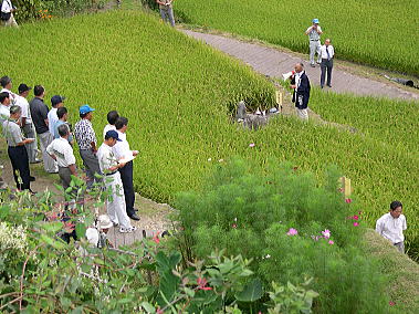 出番を待つ坂折の人 各セクションではマイク片手に農家の方による説明がありました