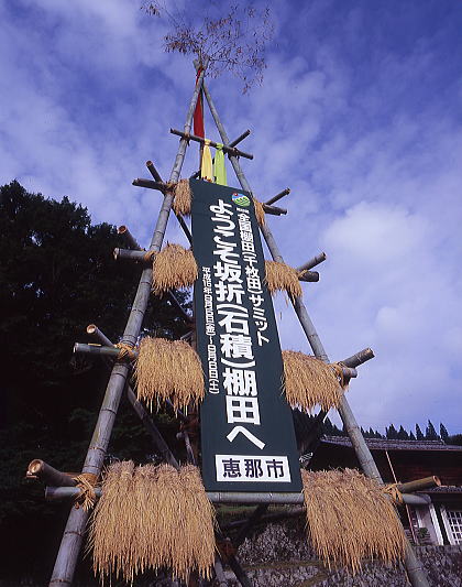 2003年9月5日・6日と岐阜県恵那市中野方町坂折で、第9回全国棚田サミットが開催されました 坂折棚田の酒屋・屋敷跡の空き地にはサミット開催を告げるモニュメントがセットされ、気分を盛 りあげています。天候にも恵まれ多くの参加者が訪れ本当によかった。